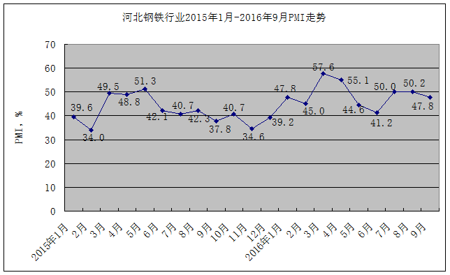 4.河北钢铁行业9月份PMI小幅下降。2016年10月1日河北省冶金行业协会发布的9月份河北省钢铁行业PMI为47.8%,环比下降2.4个百分点,最近三个月来首次陷入收缩,主要受新订单指数下降影响。9月份的新订单指数为48.4%,环比下降4.4个百分点,进入“金九”需求旺季,但钢厂销售并没有出现好转,无论是贸易商还是终端用户,采购均保持谨慎。最新公布的国内宏观经济数据显示,终端需求释放依旧相对有限。河北省钢铁行业2015年1月-2016年9月PMI走势见图1。